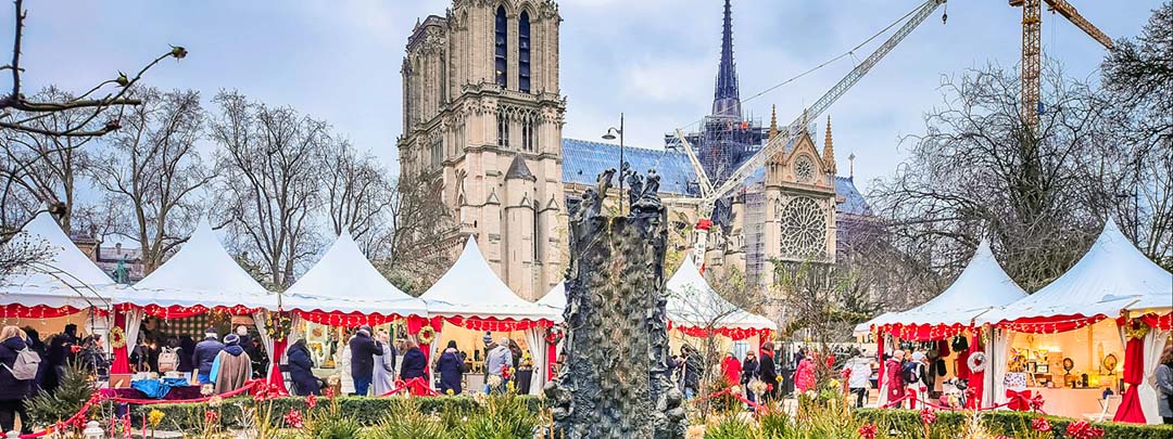 Du 28 novembre au 25 décembre 2025, le marché de Noël s’installe face à Notre-Dame, au Square René Viviani, en plein cœur du Quartier Latin. Vous y trouverez :